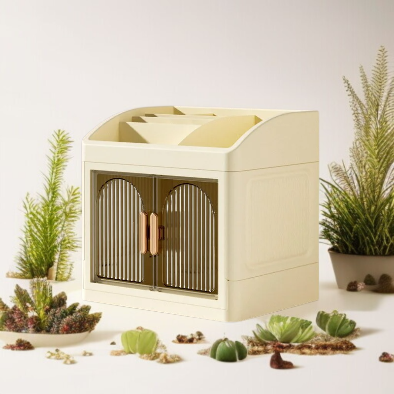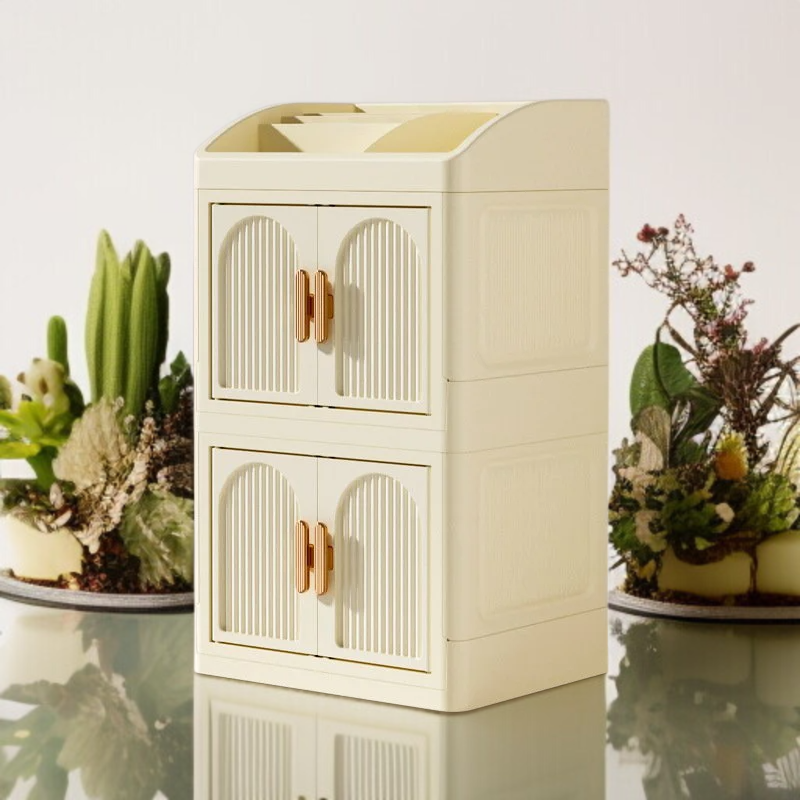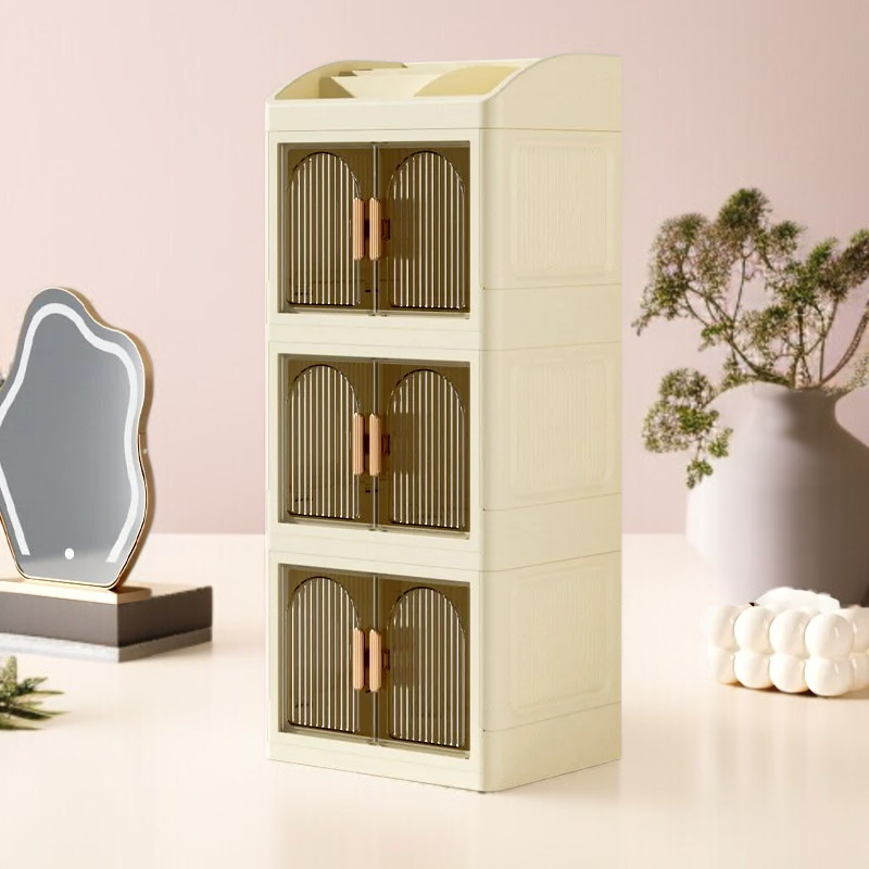 가정용 탁상 접이식 수납함 다용도 플라스틱 수납장 더블 도어 화장품 수납함 방진 레이어드 수납함